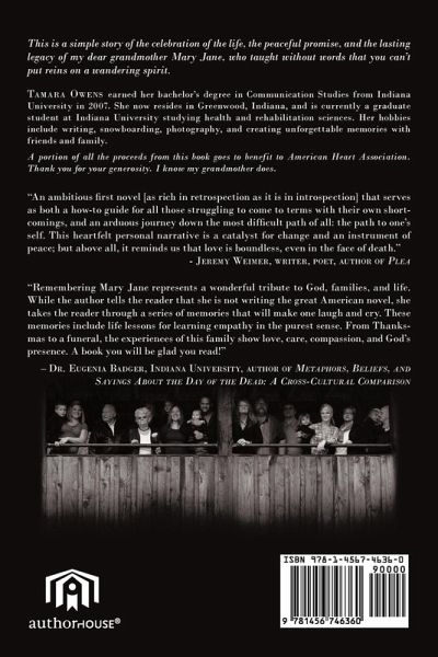 This is a simple story of the celebration of the life, the peaceful promise, and the lasting legacy of my dear grandmother Mary Jane, who taught without words that you can't put reins on a wandering spirit. "An ambitious first novel [as rich in retrospection as it is in introspection] that serves as both a how-to guide for all those struggling to come to terms with their own shortcomings, and an arduous journey down the most difficult path of all: the path to one's self. This heartfelt personal narrative is a catalyst for change and an instrument of peace; but above all, it reminds us that love is boundless, even in the face of death." -Jeremy Weimer, writer, poet, author of Plea "Remembering Mary Jane represents a wonderful tribute to God, families, and life. While the author tells the reader that she is not writing the great American novel, she takes the reader through a series of memories that will make one laugh and cry. These memories include life lessons for learning empathy in the purest sense. From Thanksmas to a funeral, the experiences of this family show love, care, compassion, and God's presence. A book you will be glad you read!" -Dr. Eugenia Badger, Indiana University, author of Metaphors, Beliefs, and Sayings About the Day of the Dead: A Cross-Cultural Comparison