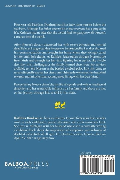 Four-year-old Kathleen Dunham loved her baby sister months before she was born. Although her father once told her that everyone has a purpose in life, Kathleen had no idea that she would find her purpose with Noreen's entrance into the world. After Noreen's doctor diagnosed her with severe physical and mental disabilities and suggested that her parents institutionalize her, they shunned his recommendation and brought her home where they lovingly cared for her until their deaths. As Kathleen leads others through Noreen's life from birth and through her last days fighting brain cancer, she vividly describes their challenges as the family learned there were few services available to help Noreen as she battled cerebral palsy, how she came to unconditionally accept her sister, and ultimately witnessed the beautiful rewards and miracles that accompanied living with her best friend. Remembering Noreen chronicles the life of a gentle soul with an intellectual disability and her remarkable influence on her family and those she met on her journey through life, as told by her sister.