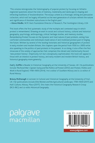 This book offers the first systematic study of the multiple and contested ways in which protest is remembered. Drawing on work in social and cultural history, cultural and historical geography, psychology, anthropology, critical heritage studies, and memory studies, Remembering Protest focuses on the dynamic and lived nature of past protests, asking how conflicted communities and individuals made sense of and mobilized protest past in forging the future. Written by several of the leading historians and historical geographers of protest in early modern and modern Britain, the chapters span the period from 1500 to c.1850 while also speaking to the politics of past protests in the present. In so doing, it also offers the first showcase of the variety of approaches that comprises the vibrant and intellectually fecund 'new protest history'. Empirically rich but conceptually sophisticated, this book will appeal to those with an interest in protest history, and early modern and modern British history, and historical geography more generally.