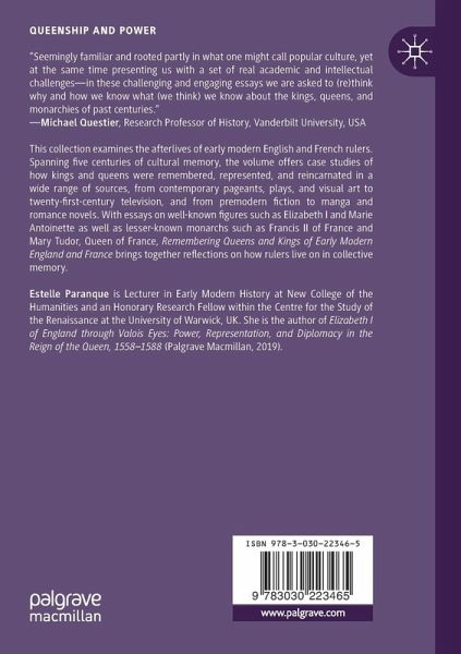 1. Introduction: Remembering, Forgetting, and the Power of Memory.- Part I Reputation in Premodern Literature.- 2. Boudicca and Elizabeth Rally Their Troops: "Two Queens Both Alike in Dignity".- 3. Princess, Duchess, Queen: Mary Tudor As Represented in a Seventeenth-Century French Love Story.- 4. Virtue Betray'd: Women Writing Anne Boleyn in the Long Eighteenth Century.- 5. "Of Hopes Great as Himselfe:" Tudor and Stuart Legacies of Edward VI.- 6. Chivalry, Nobility, and Romance: Richard Hurd and the Ideal Elizabethan Past.- Part II Reinterpretation in Art.- 7. Charles IX of France or the Anti-King: His Legacy in Plays and Chronicles in Seventeenth- and Long Eighteenth-Century France.- 8. Remembering-and Forgetting-Regicide: The Commemoration of the 30th January, 1649-1660.- 9. Henrietta Maria, "Queen of Tears"?: Picturing and Performing the Cavalier Queen.- 10. Romantic Recreations: Remembering Stuart Monarchy in Nineteenth-Century Fancy Dress Entertainments.- Part III Reincarnation in Popular Culture.- 11. She-Wolf or Feminist Heroine? Representations of Margaret of Anjou in Modern History and Literature.- 12. Reincarnating the Forgotten Francis II: From Puerile Pubescent to Heroic Heartthrob.- 13. Daenerys Targaryen as Queen Elizabeth I's Spiritual Daughter.- 14. 50 Shades of Elizabeth; or, "Doing History" in Pop Fiction.- 15. Conniving Queen, Frivolous Wife, or Romantic Heroine? The Afterlife of Queen Henrietta Maria.- 16. "Let them eat cake, she says": Assessing Marie-Antoinette's Image.