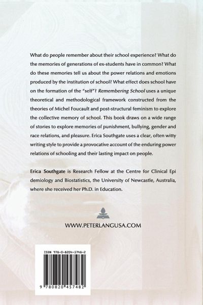 What do people remember about their school experience? What do the memories of generations of ex-students have in common? What do these memories tell us about the power relations and emotions produced by the institution of school? What effect does school have on the formation of the «self»? Remembering School uses a unique theoretical and methodological framework constructed from the theories of Michel Foucault and post-structural feminism to explore the collective memory of school. This book draws on a wide range of stories to explore memories of punishment, bullying, gender and race relations, and pleasure. Erica Southgate uses a clear, often witty, writing style to provide a provocative account of the enduring power relations of schooling and their lasting impact on people.