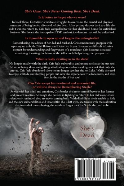 She's Gone. She's Never Coming Back. She's Dead. Is it better to forget who we were? In book three, Detective Cris Steele struggles to overcome the mental and physical remnants of being buried alive and left for dead. After getting thrown back to a life she didn't want to return to, Cris feels compelled to visit her childhood home for unfinished business. She dreads the inescapable PTSD and suicide demons that will be unleashed. Is it possible to open up and forgive the unforgivable? Remembering the advice of her dad and husband, Cris continuously grapples with opening up to both Chief Bolton and Detective Bryan. Even more difficult is Luke's request for understanding and forgiveness of a murderer. Cris becomes obsessed, wondering if visiting the house of the killer could help change her perspective. What is really awaiting us in the dark? No longer an ally with the dark, Cris feels vulnerable, and unease settles as the sun sets. Afraid of being alone and getting attacked again shadows and figures lurk that only she can see. Cris feels abandoned since she no longer sees her dad or Luke. While she used to enjoy solitude and shutting people out, now she experiences true loneliness, and even fear, in the depths of her soul. Can Cris accept her newfound and unwanted life, or will she always be Remembering Steele? At war with her mind and emotions, Cris battles the inner turmoil between her former and present realities. Although she persists in fighting to return to her old ways, Cris is relentlessly reminded they are never coming back. With disabilities she is unable to hide and the new vulnerabilities and insecurities she is left with, she tussles with the realization that instead of remembering, she needs to forget the Cris Steele she used to be.