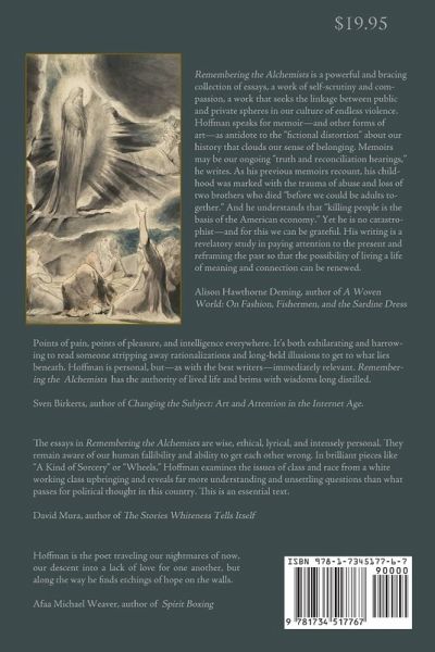Remembering the Alchemists is an intense, passionate, and moving collection of personal essays that never loses sight of the moral issues it raises. At times thoughtful and wise and at other times a cri de cur, it is held together by the experienced voice of an essayist at the top of his game. Richard Hoffman speaks softly, even reverently, in the presence of art and the natural world, but addressing militarism, war, and violence against children, he writes with urgency and earnest questioning. Several of these essays ask how it is that we seem to have given up on ourselves, and what it might take to turn the cascading traumas of history into compassion for one another and lessons for the future. In this award-winning poet's fourth book of prose, sentences can open into reverie or stop you in your tracks. Whether he is writing about a painting, the work of another writer, a tree that grew in front of his boyhood home, the atrocities visited upon children, the superstructure of exploitation and oppression, or the responsibility to be "good ancestor," Hoffman pleads with us to move beyond familiar tropes and assumptions and relinquish a learned despondency that ensures a future of more wars, ongoing injustice, and stifled potential. He transforms personal experience not into "the universal," that categorical abstraction, but into the public, the civic, the ethically useful. These seventeen essays aspire to do more than diagnose our current malaise; they attempt to lift us from it, to clarify our situation, to encourage and inspire. Although Hoffman's candor can at times be shocking, the beauty, intelligence, and bracing clarity of his vision challenges readers to meet the demands of our historical moment with confidence. Insisting that no conclusions are foregone, Remembering the Alchemists is ultimately a book about what it means to hope, to have faith, to see clearly and still insist on joy.