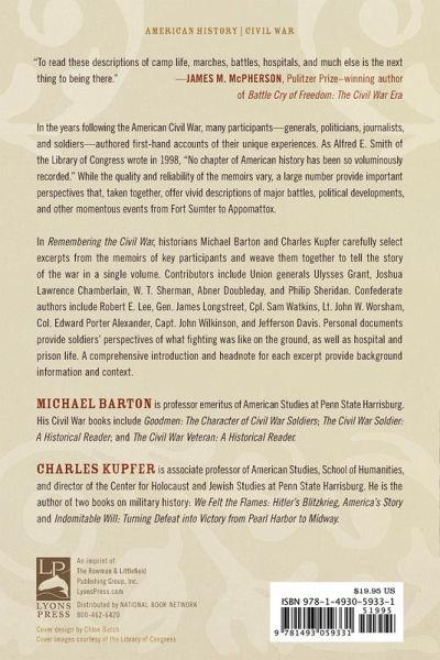 In the years following the American Civil War, many participants-generals, politicians, journalists, and soldiers-authored first-hand accounts of their unique experiences. As Alfred E. Smith of the Library of Congress wrote in 1998, "No chapter of American history has been so voluminously recorded." While the quality and reliability of the memoirs vary, a large number provide important perspectives that, taken together, offer vivid descriptions of major battles, political developments, and other momentous events from Fort Sumter to Appomattox. In Remembering the Civil War, historians Michael Barton and Charles Kupfer carefully select excerpts from the memoirs of key participants and weave them together to tell the story of the war in a single volume. Contributors include Union generals Ulysses Grant, Joshua Lawrence Chamberlain, W.T. Sherman, Abner Doubleday, and Philip Sheridan. Confederate authors include Robert E. Lee, Gen. James Longstreet, Cpl. Sam Watkins, Lt. John W. Worsham, Col. Edward Porter Alexander, Capt. John Wilkinson, and Jefferson Davies. Personal documents provide soldiers' perspectives of what fighting was like on the ground, as well as hospital and prison life. A comprehensive introduction and headnote for each excerpt provide background information and context.