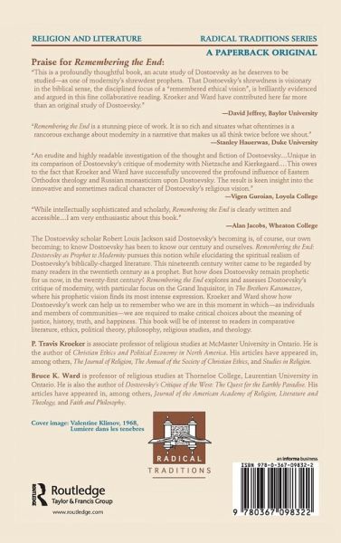 The Dostoevsky scholar Robert Louis Jackson said Dostoevsky's becoming is, of course, our own becoming; to know Dostoevsky has been to know our century and ourselves. Remembering the End: Dostoevsky as Prophet to Modernity pursues this statement while elucidating the spiritual realism of Dostoevsky's Biblically charged literary art.