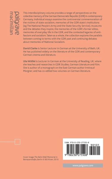 Foreword Notes on the Contributors PART I: INTRODUCTION Remembering the German Democratic Republic in a United Germany; D.Clarke & U.Wolfel The Politics of Remembering the GDR: Official and State-Mandated Memory since 1990; A.Beattie PART II: MEMORIALS AND MUSEUMS Representations of the Everyday and the Making of Memory: GDR History in Exhibitions and Museums; A.Ludwig Reinterpreting the Soviet War Memorial in Berlin's Treptower Park after 1990; C.Glore Crimmins 'Transforming Berlin's Memory: Non-State Actors and GDR Memorial Politics Today; J.Wustenberg Reinventing Rosa Luxemburg: Commemorating Rosa Luxemburg in the Berlin Republic; B.Konczol PART III: GENERATIONS Histories and Memories: Verklarung or Erklarung?; M.Fulbrook Generation and Transition: East German Memory Cultures; R.Lehmann PART IV: ORDINARY LIVES Did Communists Have Better Sex? Sex and the Body in German Reunification; J.McLellan From the 'Niche Society' to a Retreat from the World: East German Allotments as the Continuation of a GDR Tradition; A-M.Pailhes 'The Era Has Passed, But It's Nice to Remember': Eastern Identifications with the GDR Past and Unified Germany; C.Hyland Remembering the Uprising of 17 June 1953; R.Millington PART V: ELITE MEMORIES Red Radiation: East German Army Officers in Post-Unification Germany; A.Bickford Autobiography as Participation in the 'Master Narrative': GDR Academics after Unification; C.Lahusen 'The Past Does Not Repeat Itself, But it Rhymes': Autobiographies by Elites from the Confederation of States of America and the German Democratic Republic; S.Zahlmann At Home with the Stasi: Gedenkstatte Hohenschonhausen as Historic House; S.Jones Memories and Fantasies about and by the Stasi; D.Bathrick Between Denigration, Idealization and Historicization: Memories of Nazism and Everyday Antifascism; J.Sayner PART VII: REMEMBERING ANTIFASCISM How Memory is Remembered: The Potsdam Memory Archive 1995-1996; H.Peitsch Notes Bibliography