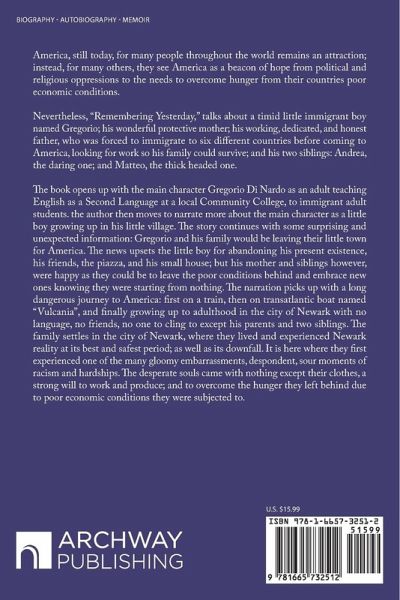 America, still today, for many people throughout the world remains an attraction; instead, for many others, they see America as a beacon of hope from political and religious oppressions to the needs to overcome hunger from their countries poor economic conditions. Nevertheless, "Remembering Yesterday," talks about a timid little immigrant boy named Gregorio; his wonderful protective mother; his working, dedicated, and honest father, who was forced to immigrate to six different countries before coming to America, looking for work so his family could survive; and his two siblings: Andrea, the daring one; and Matteo, the thick headed one. The book opens up with the main character Gregorio Di Nardo as an adult teaching English as a Second Language at a local Community College, to immigrant adult students. the author then moves to narrate more about the main character as a little boy growing up in his little village. The story continues with some surprising and unexpected information: Gregorio and his family would be leaving their little town for America. The news upsets the little boy for abandoning his present existence, his friends, the piazza, and his small house; but his mother and siblings however, were happy as they could be to leave the poor conditions behind and embrace new ones knowing they were starting from nothing. The narration picks up with a long dangerous journey to America: first on a train, then on transatlantic boat named "Vulcania", and finally growing up to adulthood in the city of Newark with no language, no friends, no one to cling to except his parents and two siblings. The family settles in the city of Newark, where they lived and experienced Newark reality at its best and safest period; as well as its downfall. It is here where they first experienced one of the many gloomy embarrassments, despondent, sour moments of racism and hardships. The desperate souls came with nothing except their clothes, a strong will to work and produce; and to overcome the hunger they left behind due to poor economic conditions they were subjected to.