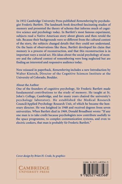 In 1932, Cambridge University Press published Remembering, by psychologist, Frederic Bartlett. The landmark book described fascinating studies of memory and presented the theory of schema which informs much of cognitive science and psychology today. Now reissued in paperback, Remembering has a new introduction by Walter Kintsch of the University of Colorado, Boulder.