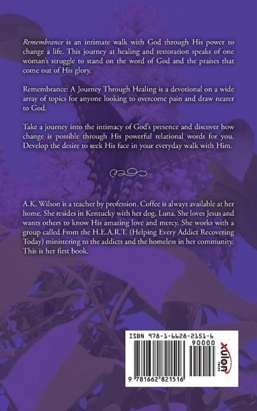 Remembrance is an intimate walk with God through His power to change lives. This journey at healing and restoration speaks of one woman's struggle to stand on the word of God and the praises that come out of His glory. The author covers a wide array of topics for anyone looking to overcome pain and draw nearer to God. A.K. Wilson is a teacher by profession. Coffee is her always available at her home. She resides in Kentucky with her dog, Luna. She loves Jesus and wants others to know His amazing love and mercy. She works with a group called From the H.E.A.R.T. (Helping Every Addict Recovering Today) ministering to the addicts and the homeless in her community. This is her first book.