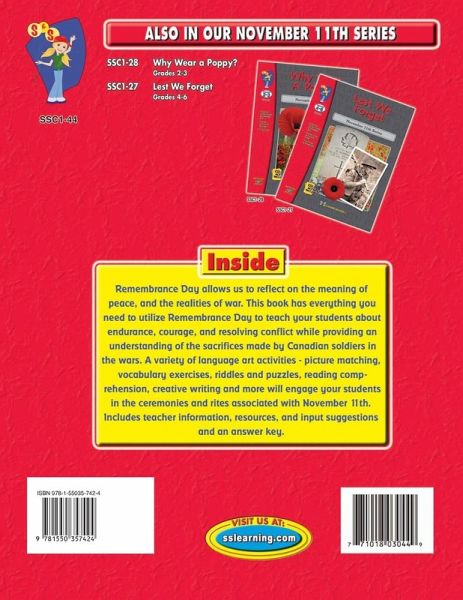 Here is everything you need to teach your students about endurance, courage, and resolving conflict while providing an understanding of the sacrifices made by Canadian soldiers in the wars. A variety of language art activities - picture matching, vocabulary exercises, riddles and puzzles, reading comprehension, creative writing, and more will engage your students in the ceremonies and rites associated with November 11th. The information and activities about Remembrance Day are designed to help students achieve the following:to recognize the sacrifice made by thousands of Canadians in the First and Second World Wars and the Korean War. to develop an understanding of the significance of Remembrance Day. to develop an awareness of the ceremonies and rites of the past as they are reflected in the present. to appreciate the realities and complexities of war. to appreciate the qualities of endurance and courage, and of devotion to the principles of freedom within our multicultural society. to learn to resolve conflict successfully. to celebrate and appreciate peace.