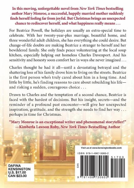 In this moving, unforgettable novel from New York Times bestselling author Mary Monroe, a successful, happily married mother suddenly finds herself feeling far from joyful. But Christmas brings an unexpected chance to rediscover herself, and what happiness really means . . . For Beatrice Powell, the holidays are usually an extra-special time to celebrate. Between her twenty-year-plus marriage, gorgeous Berkeley, California, home, and three wonderful adult children, she has everything she could desire. But change-of-life doubts are making Beatrice a stranger to herself and her bewildered family. She only finds peace volunteering at the local soup kitchen, especially helping out homeless Charles Davenport. And his sensitivity and honesty soon comfort her in ways she never imagined . . . Charles thought he had it all-until a devastating betrayal and the shattering loss of his family drove him to living on the streets. Beatrice is the first person who's truly cared about him in a long time. And little by little, he's finding reasons to care about rebuilding his life-and risking a sudden, courageous choice . . . Drawn to Charles and the temptation of a second chance, Beatrice is faced with the hardest of decisions. But his insight, secrets-and the reminder of a profound past encounter-will give her unexpected inspiration, gratitude, and the strength she needs to find her way-perhaps in time for Christmas.