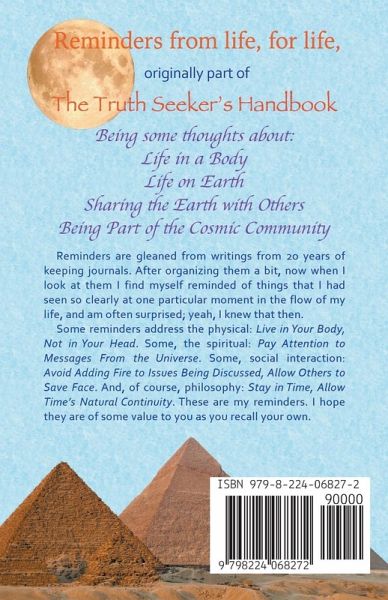 I have lived in many places, done quite a potpourri of work, and have known many unique individuals. Amidst the variety that spiced my life an integral part of a significant period of time was writing in journals. This started on San Jaun Island in Washington State in 1975. Through good times and hard times I wrote almost daily for over 20 years, recording observations, thoughts, feelings, dreams (both the nighttime and the aspirational varieties), and experiences; both physical experiences and some more etheric experiences. When I reread my journals in order to log them and make them accessible I organized a group of entries that were meant as reminders to myself. From time to time I look at these and find myself reminded of things that I had seen so clearly at one particular moment, in one environment, and among certain circumstances in the flow of my life, and am often surprised; yeah, I knew that then. Some of these reminders, whether regarding actions or attitudes, arose from contemplation and some from times I caught myself engaging in or featuring them and noticed the therapeutic benefit. I say therapeutic, but it is so much more than that. Many of these reminders are attitudes which clean house and give more space for the new and for necessary change. It is so easy to forget and be swept along. Sometimes by events. Sometimes by the attitudes and agendas of other people we come into contact with. Sometimes by people we never meet but who seem to influence our society and make demands on our lives. But perhaps, mostly, by the pressures we put on ourselves relative to all the external things of one's life. It will be noted by the shrewd reader that some of these reminders may seem to contradict each other. No doubt there is some truth to that. But each serves, I believe, to stimulate awareness of various aspects of life and various times and places along our paths. I leave them to be considered and applied when they seem helpful. Many of these reminders mean something to me in the context of my life by just reading the one line title, but in putting this collection together I have expanded on each one a little. In the process of assembling these reminders, I find myself affected; finding myself more reflective. They seem to be having the effect that was the whole point of organizing this group of journal entries in the first place. My hope is that they can be of some value to others as well.