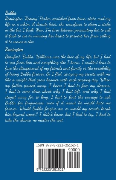 Bubba Remington "Remmy" Parker vanished from town, state, and my life on a whim. A decade later, she resurfaces to claim a stake in the bar I built. Now, I'm torn between persuading her to sell it back to me or winning her heart to prevent her from selling it to someone else. Remington Beaufort "Bubba" Williams was the love of my life, but I had to run from him and everything else I knew. I couldn't bear to face the disapproval of my friends and family or the possibility of losing Bubba forever. So I fled, carrying my secrets with me like a weight that grew heavier with each passing day. When my father passed away, I knew I had to face my demons. I had to come clean about why I had left, and why I had stayed away for so long. I had to find the courage to ask Bubba for forgiveness, even if it meant he would hate me forever. Would Bubba forgive me, or would my secrets break him beyond repair? I didn't know, but I had to try. I had to take the chance, no matter the cost.