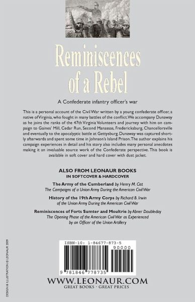 A Confederate infantry officer's war This is a personal account of the Civil War written by a young confederate officer, a native of Virginia, who fought in many battles of the conflict. We accompany Dunaway as he joins the ranks of the 47th Virginia Volunteers and journey with him on campaign to Gaines' Mill, Cedar Run, Second Manassas, Fredericksburg, Chancellorsville and eventually to the apocalyptic battle at Gettysburg. Dunaway was captured shortly afterwards and spent some time in Johnson's Island Prison. The author explains his campaign experiences in detail and his story also includes many personal anecdotes making it an invaluable source work of the Confederate perspective. This book is available in soft cover and hard cover with dust jacket.