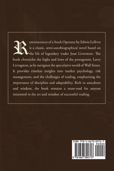 Reminiscences of a Stock Operator: A Classic Tale of Risk, Strategy, and the Psychology of Wall Street Edwin Lefèvre (1871-1943) was an American journalist, author, and diplomat best known for his writing on finance and speculation during the early 20th century. Born in Panama and educated in the United States, Lefèvre began his career as a financial reporter and later became a respected chronicler of Wall Street life. His keen insights into market behavior and the personalities of high-stakes traders gave his work both immediacy and lasting value. Though he published several works of fiction and nonfiction, he is best remembered for Reminiscences of a Stock Operator, a semi-fictionalized account of the life and lessons of a legendary trader. Reminiscences of a Stock Operator, first published in 1923, offers a vivid and timeless portrayal of the ups and downs of speculative trading through the fictional character of Larry Livingston, a thinly veiled stand-in for real-life trader Jesse Livermore. The book explores not only the mechanics of trading stocks, commodities, and markets, but also the emotional discipline, psychological pitfalls, and patterns of human behavior that underlie success and failure on Wall Street. With its blend of anecdote, wisdom, and financial philosophy, the work remains a cornerstone of investment literature-essential reading for traders, economists, and anyone fascinated by the drama of financial markets.