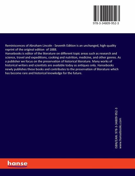 Reminiscences of Abraham Lincoln - Seventh Edition is an unchanged, high-quality reprint of the original edition of 1888.Hansebooks is editor of the literature on different topic areas such as research and science, travel and expeditions, cooking and nutrition, medicine, and other genres. As a publisher we focus on the preservation of historical literature. Many works of historical writers and scientists are available today as antiques only. Hansebooks newly publishes these books and contributes to the preservation of literature which has become rare and historical knowledge for the future.