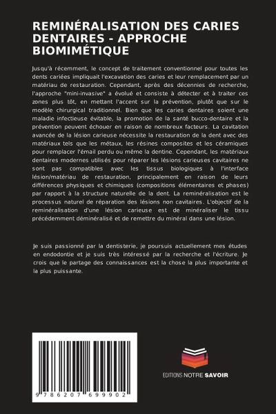 Jusqu'à récemment, le concept de traitement conventionnel pour toutes les dents cariées impliquait l'excavation des caries et leur remplacement par un matériau de restauration. Cependant, après des décennies de recherche, l'approche "mini-invasive" a évolué et consiste à détecter et à traiter ces zones plus tôt, en mettant l'accent sur la prévention, plutôt que sur le modèle chirurgical traditionnel. Bien que les caries dentaires soient une maladie infectieuse évitable, la promotion de la santé bucco-dentaire et la prévention peuvent échouer en raison de nombreux facteurs. La cavitation avancée de la lésion carieuse nécessite la restauration de la dent avec des matériaux tels que les métaux, les résines composites et les céramiques pour remplacer l'émail perdu ou même la dentine. Cependant, les matériaux dentaires modernes utilisés pour réparer les lésions carieuses cavitaires ne sont pas compatibles avec les tissus biologiques à l'interface lésion/matériau de restauration, principalement en raison de leurs différences physiques et chimiques (compositions élémentaires et phases) par rapport à la structure naturelle de la dent. La reminéralisation est le processus naturel de réparation des lésions non cavitaires. L'objectif de la reminéralisation d'une lésion carieuse est de minéraliser le tissu précédemment déminéralisé et de remettre du minéral dans une lésion.