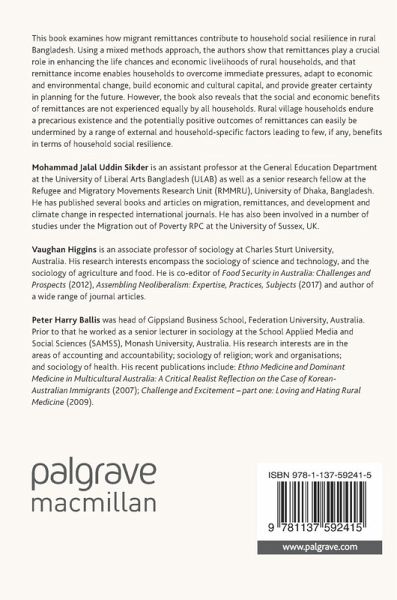 This book examines how migrant remittances contribute to household social resilience in rural Bangladesh. Using a mixed methods approach, the authors show that remittances play a crucial role in enhancing the life chances and economic livelihoods of rural households, and that remittance income enables households to overcome immediate pressures, adapt to economic and environmental change, build economic and cultural capital, and provide greater certainty in planning for the future. However, the book also reveals that the social and economic benefits of remittances are not experienced equally by all households. Rural village households endure a precarious existence and the potentially positive outcomes of remittances can easily be undermined by a range of external and household-specific factors leading to few, if any, benefits in terms of household social resilience.