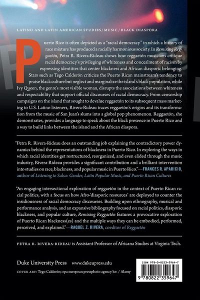 Puerto Rico is often depicted as a "racial democracy" in which a history of race mixture has produced a racially harmonious society. In Remixing Reggaetón, Petra R. Rivera-Rideau shows how reggaetón musicians critique racial democracy's privileging of whiteness and concealment of racism by expressing identities that center blackness and African diasporic belonging. Stars such as Tego Calderón criticize the Puerto Rican mainstream's tendency to praise black culture but neglecting and marginalizing the island's black population, while Ivy Queen, the genre's most visible woman, disrupts the associations between whiteness and respectability that support official discourses of racial democracy. From censorship campaigns on the island that sought to devalue reggaetón, to its subsequent mass marketing to U.S. Latino listeners, Rivera-Rideau traces reggaetón's origins and its transformation from the music of San Juan's slums into a global pop phenomenon. Reggaetón, she demonstrates, provides a language to speak about the black presence in Puerto Rico and a way to build links between the island and the African diaspora.