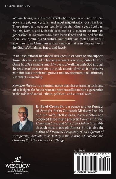 We are living in a time of great challenge in our nation, our government, our culture, and most importantly, our families. These times and seasons testify to us that God needs Joshuas, Esthers, Davids, and Deborahs to come to the scene of our troubled generation as warriors who have been fitted and trained for the social, civic, ethnic, and cultural battles that are robbing us of our true identity as Christians and as a nation that is in covenant with the God of Abraham, Isaac, and Jacob. In an inspirational handbook designed to encourage and support those who feel called to become remnant warriors, Pastor E. Ford Grant Jr. offers insights into fifty years of walking with God through the seasons of tests and trials to guide recruits down an introspective path that leads to spiritual growth and development, and ultimately a remnant awakening. Remnant Warrior is a spiritual guide that shares training tools and other insights for future remnant warriors called to help a generation in the midst of social, ethnic, political, and cultural wars.