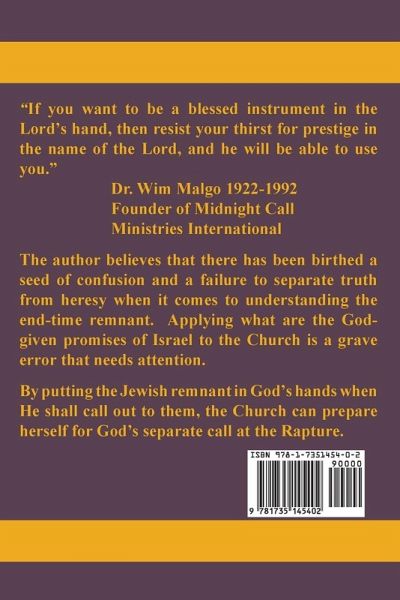 There is no remnant, Jewish or Christian present today, Romans 11:5 notwithstanding misinterpretations, refers to a remnant at the beginning of the Age of Grace dispensation. There is no Christian remnant and to misuse the term for Christians or the Church is in violation of God's rule for remnants that He has maintained throughout history. What God has given us is a view of Israel's future remnant, which He is yet to call. This book is about the Eschatological Jewish remnant, empowered by God to flee the Antichrist and his Abomination of Desolation, into the Wilderness. There God preserves the Jewish remnant and brings them into the Kingdom of God.