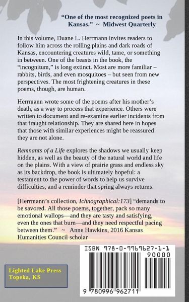 In this volume, Duane L. Herrmann invites readers to follow him across the rolling plains and dark roads of Kansas, encountering creatures wild, tame, or something in between. One of the beasts in the book, the "incognitum," is long extinct. Most are more familiar - rabbits, birds, and even mosquitoes - but seen from new perspectives. The most frightening creatures in these poems, though, are human. Herrmann wrote some of the poems after his mother's death, as a way to process that experience. Others were written to document and re-examine earlier incidents from that fraught relationship. They are shared here in hopes that those with similar experiences might be reassured they are not alone. Remnants of a Life explores the shadows we usually keep hidden, as well as the beauty of the natural world and life on the plains. With a view of prairie grass and endless sky as its backdrop, the book is ultimately hopeful: a testament to the power of words to help us survive difficulties, and a reminder that spring always returns.