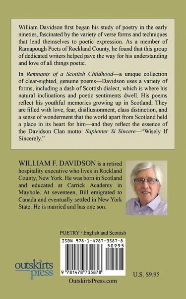 William Davidson first began his study of poetry in the early nineties, fascinated by the variety of verse forms and techniques that lend themselves to poetic expression. As a member of Ramapough Poets of Rockland County, he found that this group of dedicated writers helped pave the way for his understanding and love of all things poetic. In Remnants of a Scottish Childhood-a unique collection of clear-sighted, genuine poems-Davidson uses a variety of forms, including a dash of Scottish dialect, which is where his natural inclinations and poetic sentiments dwell. His poems reflect his youthful memories growing up in Scotland. They are filled with love, fear, disillusionment, class distinction, and a sense of wonderment that the world apart from Scotland held a place in its heart for him-and they reflect the essence of the Davidson Clan motto: Sapienter Si Sincere-"Wisely If Sincerely."