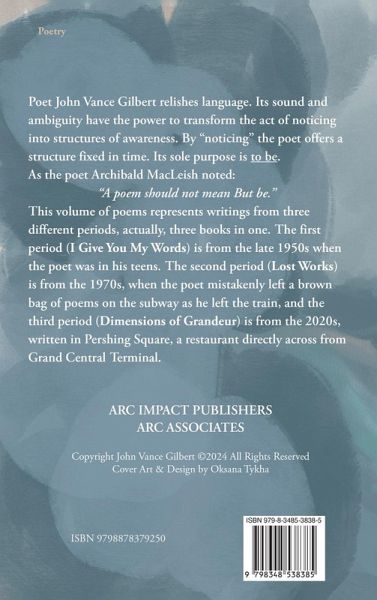 Poet John Vance Gilbert relishes language. Its sound and ambiguity have the power to transform the act of noticing into structures of awareness. By "noticing" the poet offers a structure fixed in time. Its sole purpose is to be. As the poet Archibald MacLeish noted: "A poem should not mean But be." This volume of poems represents writings from three different periods, actually, three books in one. The first period (I Give You My Words) is from the late 1950s when the poet was in his teens. The second period (Lost Works) is from the 1970s, when the poet mistakenly left a brown bag of poems on the subway as he left the train, and the third period (Dimensions of Grandeur) is from the 2020s, written in Pershing Square, a restaurant directly across from Grand Central Terminal.