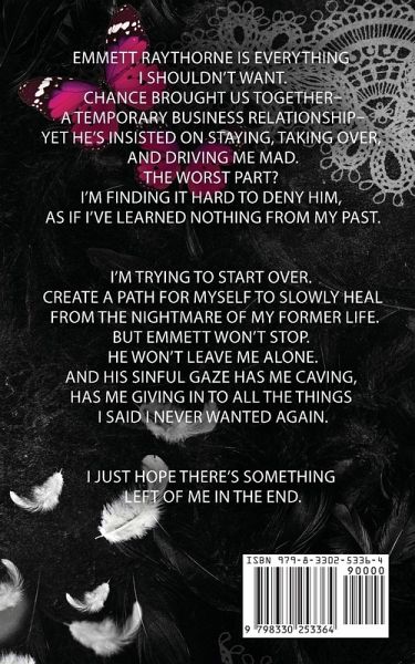 Emmett Raythorne is everything I shouldn't want. Chance brought us together-a temporary business relationship-yet he's insisted on staying, taking over, and driving me mad. The worst part? I'm finding it hard to deny him, as if I've learned nothing from my past. I'm trying to start over. Create a path for myself to slowly heal from the nightmare of my former life. But Emmett won't stop. He won't leave me alone. And his sinful gaze has me caving, has me giving in to all the things I said I never wanted again. I just hope there's something left of me in the end.