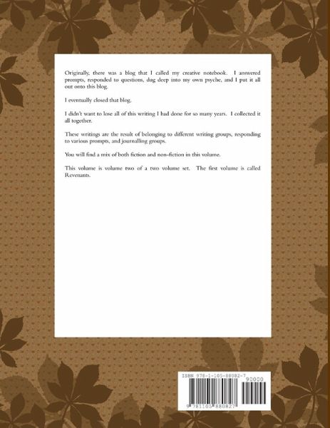Originally, there was a blog that I called my creative notebook. I answered prompts, responded to questions, dug deep into my own psyche, and I put it all out onto this blog. I eventually closed that blog. I didn't want to lose all of this writing I had done for so many years. I collected it all together. These writings are the result of belonging to different writing groups, responding to various prompts, and journalling groups. You will find a mix of both fiction and non-fiction in this volume. This volume is volume two of a two volume set. The first volume is called Revenants.