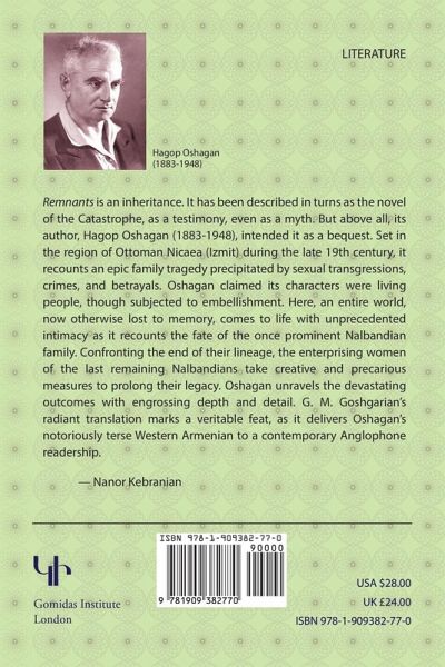 This is a classic novel set in the late Ottoman Empire. Oshagan's Remnants: The Way of the Womb, Book 1 (Mnatsortats in the original Armenian) is his magnum opus and the culmination of a series of powerful, innovative novels on Muslim-Christian, and especially Turkish-Armenian, relations in the Ottoman Empire. Remnants is a literary reconstruction of the pre-genocide world of the Armenians told through the horrific collapse of a family, the Nalbandians. The author intended the novel to be divided into three parts (Part I: The Way of the Womb; Part II: The Way of Blood; Part III: Hell) but was unable to write the third part, which was to be devoted to the extermination of the Armenians, depicting the twenty-four hours during which the Armenian population of Bursa was annihilated. This is by far one of the most important, innovative novels ever written on the Ottoman Empire and social relations among its diverse Muslim and Christian populations. This work has been translated into English by a preeminent scholar and mainstream translator, G. M. Goshgarian.