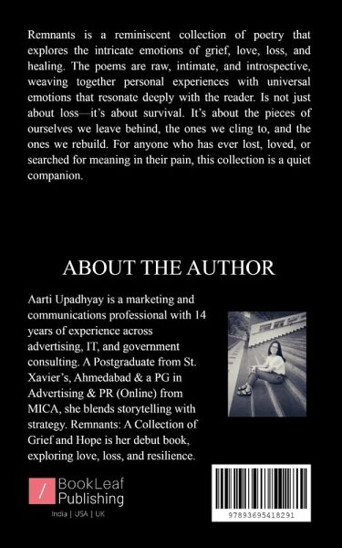 Remnants is a deeply moving and evocative collection of poetry that explores the intricate emotions of grief, love, loss, and healing. The poems are raw, intimate, and profoundly introspective, weaving together personal experiences with universal emotions that resonate deeply with the reader. It is not just about loss-it's about survival. It's about the pieces of ourselves we leave behind, the ones we cling to, and the ones we rebuild. For anyone who has ever lost, loved, or searched for meaning in their pain, this collection is a quiet, companion.