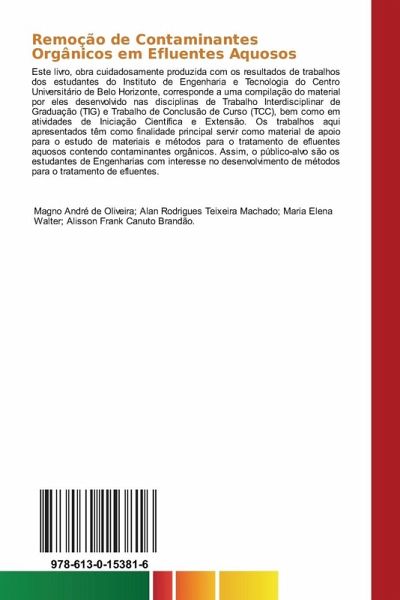 Este livro, obra cuidadosamente produzida com os resultados de trabalhos dos estudantes do Instituto de Engenharia e Tecnologia do Centro Universitário de Belo Horizonte, corresponde a uma compilação do material por eles desenvolvido nas disciplinas de Trabalho Interdisciplinar de Graduação (TIG) e Trabalho de Conclusão de Curso (TCC), bem como em atividades de Iniciação Científica e Extensão. Os trabalhos aqui apresentados têm como finalidade principal servir como material de apoio para o estudo de materiais e métodos para o tratamento de efluentes aquosos contendo contaminantes orgânicos. Assim, o público-alvo são os estudantes de Engenharias com interesse no desenvolvimento de métodos para o tratamento de efluentes.