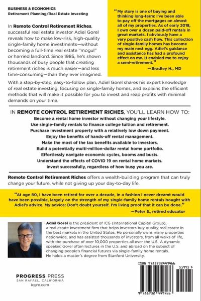 Amazon Bestseller! ¿¿"My story is one of buying and thinking long-term: I've been able to pay off the mortgages on almost all of my properties. As of early 2018, I own over a dozen paid-off rentals in great markets. I obviously have a very positive cash flow. This collection of single-family homes has become my main nest egg. Adiel's guidance and assistance has had a profound effect on me. It enabled me to enjoy a semi-retirement." -Bradley H., MD "At age 80, I have been retired for over a decade, in a fashion I never dreamt would have been possible, largely on the strength of my single-family home rentals bought with Adiel's advice. My advice: Don't doubt yourself. I'm living proof that it can be done." -Peter S., retired educator In Remote Control Retirement Riches, successful real estate investor Adiel Gorel reveals how to make low-risk, high-quality single-family home investments-without becoming a full-time real estate "mogul" or harried landlord. Since 1985, he's shown thousands of busy people that creating retirement riches is much easier-and less time-consuming-than they ever imagined. With a step-by-step, easy-to-follow plan, Adiel Gorel shares his expert knowledge of real estate investing, focusing on single-family homes, and explains the efficient methods that will make it possible for you to invest and reap profits with minimal demands on your time. In Remote Control Retirement Riches, you'll learn how to: Become a rental home investor without changing your lifestyle. Use single-family rentals to finance college tuition and retirement. Purchase investment property with a relatively low down payment. Enjoy the benefits of hands-off rental management. Make the most of the tax benefits available to investors. Build a potentially multi-million-dollar rental home portfolio. Learn to effortlessly navigate economic cycles, booms, and busts. Understand the effects of COVID 19 on rental homes. Learn how to invest successfully, regardless of how busy you are. Remote Control Retirement Riches offers a wealth-building program that can truly change your future, while not giving up your day-to-day life. Scroll up to buy your copy today!