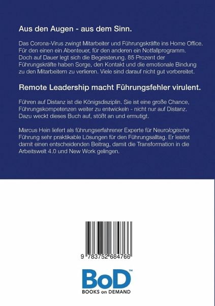 Aus den Augen - aus dem Sinn. Das Corona-Virus zwingt Mitarbeiter und Führungskräfte ins Home Office. Für den einen ein Abenteuer, für den anderen ein Notfallprogramm. Doch auf Dauer legt sich die Begeisterung. 85 Prozent der Führungskräfte haben Sorge, den Kontakt und die emotionale Bindung zu den Mitarbeitern zu verlieren. Viele sind darauf nicht gut vorbereitet. Remote Leadership macht Führungsfehler virulent. Führen auf Distanz ist die Königsdisziplin. Sie ist eine große Chance, Führungskompetenzen weiter zu entwickeln - nicht nur auf Distanz. Dazu weckt dieses Buch auf, stößt an und ermutigt. Marcus Hein liefert als führungserfahrener Experte für Neurologische Führung sehr praktikable Lösungen für den Führungsalltag. Er leistet damit einen entscheidenden Beitrag, damit die Transformation in die Arbeitswelt 4.0 und New Work gelingen.