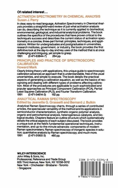 Activation Spectrometry in Chemical Analysis Susan J. Parry In clear, easy-to-read language, Activation Spectrometry in Chemical Analysis provides a straightforward review of just what activation analysis can do, describing the technique as it is currently applied to biomedical, environmental, geological, and industrial analytical problems. The book outlines the specifics of the procedures that have proven critical to the technique's success and describes the current status of activation spectrometry in a concise, three-part format: principles, techniques, and applications. Written for undergraduates and postgraduates in universities, research institutes, government, or industry, the book provides the first definitive look at the day-to-day and key uses of the method that is at once challenging and intriguing, yet simple to grasp. 1991 (0 471-63844-7) 264 pp. Principles and Practice of Spectroscopic Calibration Howard Mark Clearly linking theory with applications, this unique guide to spectroscopic calibration advances an approach that is understandable, free of the usual uncertainties, and simple to execute. The book details the practical aspects of generating a calibration equation, as well as the basics of recognizing and dealing with different types of problems affecting calibration. Most of the procedures are applicable to such sophisticated and popular approaches as Principal Component Calibration (PCA), Partial Least Squares Calibration (PLS), and Fourier Transform Calibration. 1991 (0 471-54614-3) 192 pp. Analytical Raman Spectroscopy Edited by Jeanette G. Grasselli and Bernard J. Bulkin Analytical Raman Spectroscopy charts, through a series of contributed articles, the spectacular versatility of the method and its applications in semiconductor characterization, synthetic organic polymer analysis, organic and petrochemical analysis, heterogeneous catalysts, and biological studies. Chapters feature an outline structure which systematically details the critical aspects of each subject discussed. The book provides a unique look at the field's fundamental operational techniques, instrumentation, and up-to-the-minute advances: components of modern Raman spectrometers; Raman spectroscopy of inorganic species in solution; quantitative analysis by Raman spectroscopy; and much more. 1991 (0 471-51955-3) 480 pp.