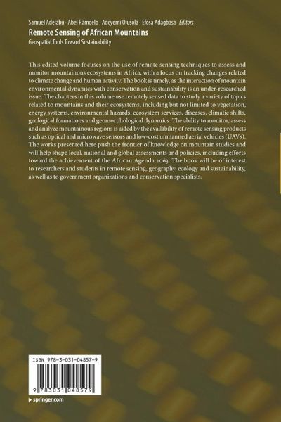 This edited volume focuses on the use of remote sensing techniques to assess and monitor mountainous ecosystems in Africa, with a focus on tracking changes related to climate change and human activity. The book is timely, as the interaction of mountain environmental dynamics with conservation and sustainability is an under-researched issue. The chapters in this volume use remotely sensed data to study a variety of topics related to mountains and their ecosystems, including but not limited to vegetation, energy systems, environmental hazards, ecosystem services, diseases, climatic shifts, geological formations and geomorphological dynamics. The ability to monitor, assess and analyze mountainous regions is aided by the availability of remote sensing products such as optical and microwave sensors and low-cost unmanned aerial vehicles (UAVs). The works presented here push the frontier of knowledge on mountain studies and will help shape local, national and global assessments and policies, including efforts toward the achievement of the African Agenda 2063. The book will be of interest to researchers and students in remote sensing, geography, ecology and sustainability, as well as to government organizations and conservation specialists.