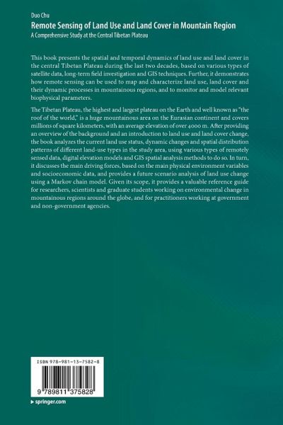 This book presents the spatial and temporal dynamics of land use and land cover in the central Tibetan Plateau during the last two decades, based on various types of satellite data, long-term field investigation and GIS techniques. Further, it demonstrates how remote sensing can be used to map and characterize land use, land cover and their dynamic processes in mountainous regions, and to monitor and model relevant biophysical parameters.