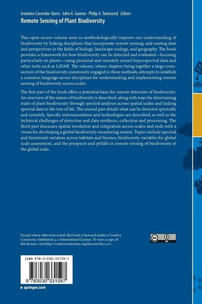 Chapter1. The use of remote sensing to enhance biodiversity monitoring & detection-a critical challenge for the 21st century. - Chapter2. Applying Remote Sensing to Biodiversity Science.- Chapter3. Scaling Functional Traits from Leaves to Canopies.- Chapter4. The Laegeren Site: An Augmented Forest Laboratory.- Chapter5. Lessons Learned from Spectranomics: Wet Tropical Forests.- Chapter6. Remote Sensing for Early, Detailed, and Accurate Detection of Forest Disturbance and Decline for Protection of Biodiversity.- Chapter7. Linking Leaf Spectra to the Plant Tree of Life.- Chapter8. Linking Foliar Traits to Belowground Processes.- Chapter9. Linking Foliar Traits to Belowground Processes.- Chapter9. Using Remote Sensing for Modeling and Monitoring Species Distributions.- Chapter10. Remote Sensing of Geodiversity as a Link to Biodiversity.- Chapter11. Predicting Patterns of Plant Diversity and Endemism in the Tropics Using Remote Sensing Data: A Study Case From the Brazilian Atlantic Forest.- Chapter12. Remote Detection of Invasive Alien Species.- Chapter13. A Range of Earth Observation Techniques for Assessing Plant Diversity.- Chapter14. How the Optical Properties of Leaves Modify the Absorption and Scattering of Energy and Enhance Leaf Functionality.- Chapter15. Spectral Field Campaigns: Planning and Data Collection.- Chapter16. Consideration of Scale in Remote Sensing of Biodiversity.- Chapter17. Integrating Biodiversity, Remote Sensing, and Auxiliary Information for the Study of Ecosystem Functioning and Conservation at Large Spatial Scales.- Chapter18. Essential Biodiversity Variables: Integrating in Situ Observations and Remote Sensing Through Modeling.- Chapter19. Prospects and pitfalls for spectroscopic remote sensing of biodiversity at the global scale.- Chapter20. Epilogue - Towards a Global Biodiversity Monitoring System.