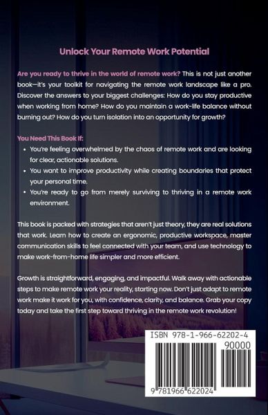 Unlock Your Remote Work Potential Are you ready to thrive in the world of remote work? This is not just another book-it's your toolkit for navigating the remote work landscape like a pro. Discover the answers to your biggest challenges: How do you stay productive when working from home? How do you maintain a work-life balance without burning out? How do you turn isolation into an opportunity for growth? You Need This Book If: * You're feeling overwhelmed by the chaos of remote work and are looking for clear, actionable solutions. * You want to improve productivity while creating boundaries that protect your personal time. * You're ready to go from merely surviving to thriving in a remote work environment. This book is packed with strategies that aren't just theory, they are real solutions that work. Learn how to create an ergonomic, productive workspace, master communication skills to feel connected with your team, and use technology to make work-from-home life simpler and more efficient. Growth is straightforward, engaging, and impactful. Walk away with actionable steps to make remote work your reality, starting now. Don't just adapt to remote work make it work for you, with confidence, clarity, and balance. Grab your copy today and take the first step toward thriving in the remote work revolution!