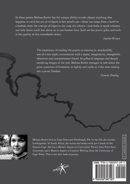 Melissa Butler lives in Cape Town and Pittsburgh, PA. In the US, she teaches kindergarten. In South Africa, she writes and works with pre schools in the Eastern Cape. She has a Masters degree in Curriculum Theory from Penn State University and a Masters degree in Creative Writing from the University of Cape Town. This is her first book of poetry.