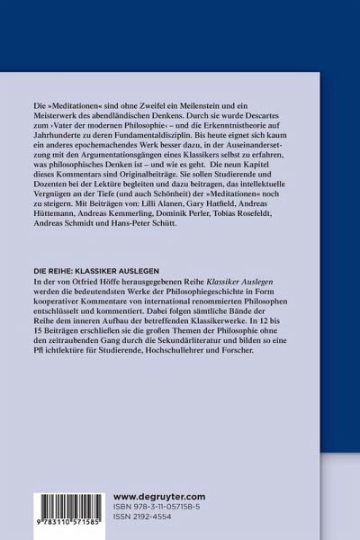 Die neun Kapitel dieses Kommentars sind Originalbeiträge. Sie sollen Studierende und Dozenten bei der Lektüre begleiten und dazu beitragen, das intellektuelle Vergnügen an der Tiefe (und auch Schönheit) der "Meditationen" noch zu steigern. Mit Beiträgen von: Lilli Alanen, Gary Hatfield, Andreas Hüttemann, Andreas Kemmerling, Tobias Rosefeldt, Andreas Schmidt und Hans-Peter Schütt.