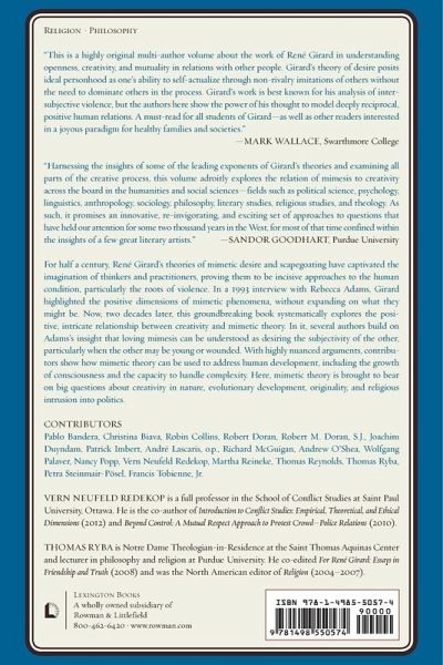 Contextual Introduction: René Girard and the Problem of Creativity Vern Neufeld Redekop and Thomas Ryba Part I. CREATIVE MIMESIS: HUMAN DEVELOPMENT Chapter 1: Transforming Intersubjective Space: From Ruthlessness to Primary Creativity and Loving Mimesis Martha Reineke Chapter 2: Mimesis and Creativity in Language Origins and Language Acquisition Christina Biava Chapter 3: The Good, the True, and the Beautiful and René Girard's Mimetic Theory Richard McGuigan and Nancy Popp Part II. ORIGINALITY AND COMPETITION Chapter 4: Modern Freedom and Creativity: "truth stripped of its cloak of time . . ." Andrew O'Shea Chapter 5: Mimetic Theory and the Question of Originality Robert Doran Chapter 6: Mimesis and Immortal Glory: How Creativity is Spurred by the Desire for One's Ideas to Dominate the Meme Pool Thomas Ryba Part III. POLITICS, POWER AND RELIGION Chapter 7: Vox popluli, Vox Dei: The Pantheistic Temptation of Democracy Wolfgang Palaver Chapter 8: The Girardian Mimetic Theory and its Reading