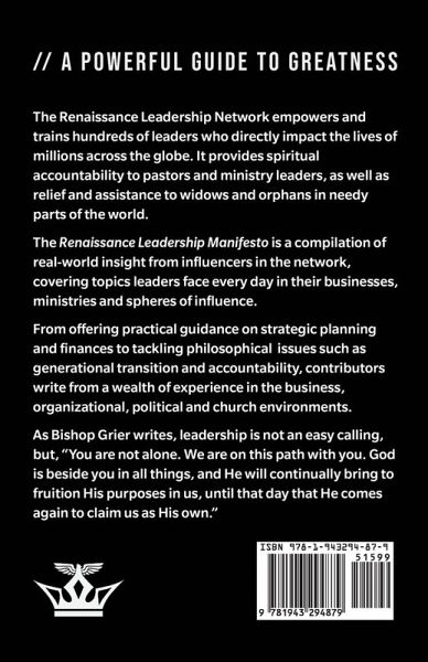 The Renaissance Leadership Network empowers and trains hundreds of leaders who directly impact the lives of millions across the globe. It provides spiritual accountability to pastors and ministry leaders as well as relief and assistance to widows and orphans in needy parts of the world. The Renaissance Leadership Manifesto is a compilation of real-world insight from influencers in the network, covering topics fleaders face every day in their businesses, ministries and spheres of influence. From offering practical guidance on strategic planning and finances to tackling philosophical issues such as generational transition and accountability, contributors write from a wealth of experience in the business, organizational, political and church environments. As Bishop Grier writes, leadership is not an easy calling, but, "You are not alone. We are on this path with you. God is beside you in all things, and He will continually bring to fruition His purposes in us, until that day that He comes again to claim us as His own."