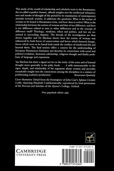 This study of the world of scholarship and scholarly texts in the Renaissance, the so-called respublica literaria, affords insights into the intellectual infrastructure and modes of thought of the period by its examination of contemporary attitudes toward women. It addresses the question: What is the notion of woman to be found in Renaissance texts, and how does it evolve? What is the relationship between the notion of woman and that of sex difference, and how is sex difference related in turn to other differences and to the concept of difference itself? Theology, medicine, ethics and politics, and law are examined in succeeding chapters. The threads of the investigation are then drawn together and Dr. Maclean shows how the notion of woman was influenced by both forces of conservatism and forces which fostered change, forces which were to be found both inside the confines of intellectual life and beyond them. The final section offers a context for the understanding of European Renaissance feminism and sketches its connections with social and political evolution, humanist scholarship, religious thought and finally problems of language and expression.