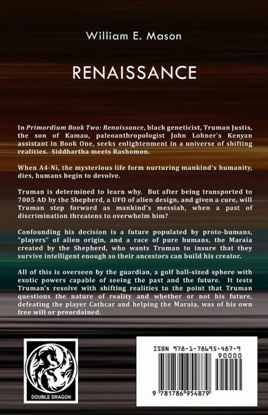 In Primordium Book Two: Renaissance, black geneticist, Truman Justis, the son of Kamau, paleoanthropologist John Lohner's Kenyan assistant in Book One, seeks enlightenment in a universe of shifting realities. Siddhartha meets Rashomon. When A4-Ni, the mysterious life form nurturing mankind's humanity, dies, humans begin to devolve. Truman is determined to learn why. But after being transported to 7005 AD by the Shepherd, a UFO of alien design, and given a cure, will Truman step forward as mankind's messiah, when a past of discrimination threatens to overwhelm him? Confounding his decision is a future populated by proto-humans, "players" of alien origin, and a race of pure humans, the Maraia created by the Shepherd, who wants Truman to insure that they survive intelligent enough so their ancestors can build his creator. All of this is overseen by the guardian, a golf ball-sized sphere with exotic powers capable of seeing the past and the future. It tests Truman's resolve with shifting realities to the point that Truman questions the nature of reality and whether or not his future, defeating the player Cathcar and helping the Maraia, was of his own free will or preordained.
