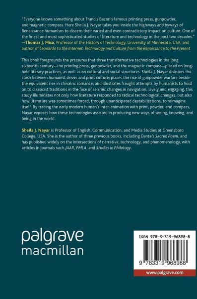This book foregrounds the pressures that three transformative technologies in the long sixteenth century-the printing press, gunpowder, and the magnetic compass-placed on long-held literary practices, as well as on cultural and social structures. Sheila J. Nayar disinters the clash between humanist drives and print culture; places the rise of gunpowder warfare beside the equivalent rise in chivalric romance; and illustrates fraught attempts by humanists to hold on to classicist traditions in the face of seismic changes in navigation. Lively and engaging, this study illuminates not only how literature responded to radical technological changes, but also how literature was sometimes forced, through unanticipated destabilizations, to reimagine itself. By tracing the early modern human's inter-animation with print, powder, and compass, Nayar exposes how these technologies assisted in producing new ways of seeing, knowing, and being in the world.