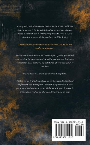 « Original, osé, diablement sombre et captivant. Addison Cain a un esprit tordu qui fait naître en moi une stupeur mêlée d'admiration. Ne manquez pas cette série ! ' Alta Hensley, auteure de best-sellers de USA Today Shepherd doit convaincre sa précieuse Claire de lui rendre son amour... Et ce avant que son désir ne le rende fou. Que sa partenaire soit en sécurité dans son nid ne suffit pas. La voir lentement succomber à ses instincts ne suffit pas. Il veut son coeur et son âme. Il en a besoin... avant qu'il ne soit trop tard. Thólos est en train de sombrer, et les hommes de Shepherd ne peuvent rien faire pour l'arrêter. La guerre est à leur porte et, à moins que le tyran Alpha ne soit prêt à payer le prix ultime, tout ce qu'il a sacrifié aura été en vain. Note de l'éditeur: Le troisième tome de cette série Dark Romance paranormale excitante et torride regorge de suspense et d'échange total de pouvoir.