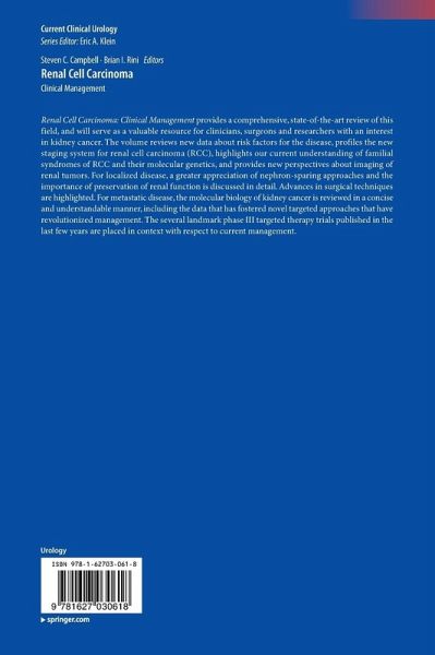 Renal Cell Carcinoma: Clinical Management provides a comprehensive, state-of-the art review of this field, and will serve as a valuable resource for clinicians, surgeons and researchers with an interest in kidney cancer. The volume reviews new data about risk factors for the disease, profiles the new staging system for renal cell carcinoma (RCC), highlights our current understanding of familial syndromes of RCC and their molecular genetics, and provides new perspectives about imaging of renal tumors. For localized disease, a greater appreciation of nephron-sparing approaches and the importance of preservation of renal function is discussed in detail. Advances in surgical techniques are highlighted. For metastatic disease, the molecular biology of kidney cancer is reviewed in a concise and understandable manner, including the data that has fostered novel targeted approaches that have revolutionized management. The several landmark phase III targeted therapy trials published inthe last few years are placed in context with respect to current management. Integration of surgery and systemic therapy through cytoreductive and consolidative approaches has yielded provocative data that promises to further advance the field, and major advances in this domain are also be discussed.
