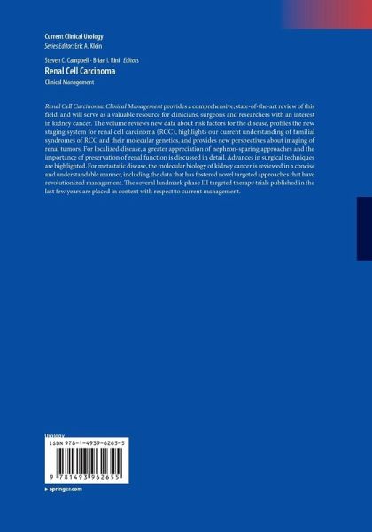 Renal Cell Carcinoma: Clinical Management provides a comprehensive, state-of-the art review of this field, and will serve as a valuable resource for clinicians, surgeons and researchers with an interest in kidney cancer. The volume reviews new data about risk factors for the disease, profiles the new staging system for renal cell carcinoma (RCC), highlights our current understanding of familial syndromes of RCC and their molecular genetics, and provides new perspectives about imaging of renal tumors. For localized disease, a greater appreciation of nephron-sparing approaches and the importance of preservation of renal function is discussed in detail. Advances in surgical techniques are highlighted. For metastatic disease, the molecular biology of kidney cancer is reviewed in a concise and understandable manner, including the data that has fostered novel targeted approaches that have revolutionized management. The several landmark phase III targeted therapy trials published inthe last few years are placed in context with respect to current management. Integration of surgery and systemic therapy through cytoreductive and consolidative approaches has yielded provocative data that promises to further advance the field, and major advances in this domain are also be discussed.